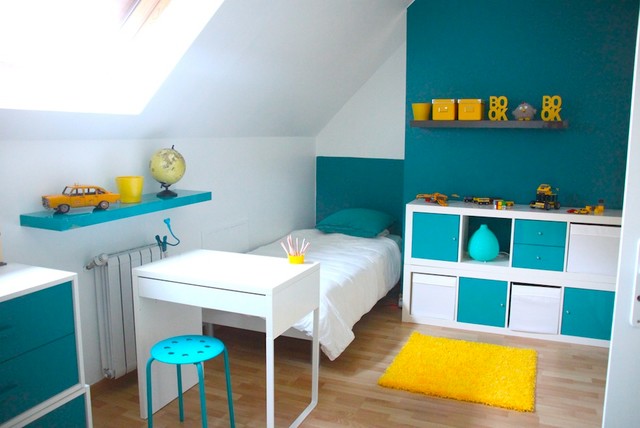 source de la photo : http://www.houzz.fr/photos/14426854/decoration-chambre-enfant-bleu-et-jaune-contemporain-chambre-d-enfant-other-metro